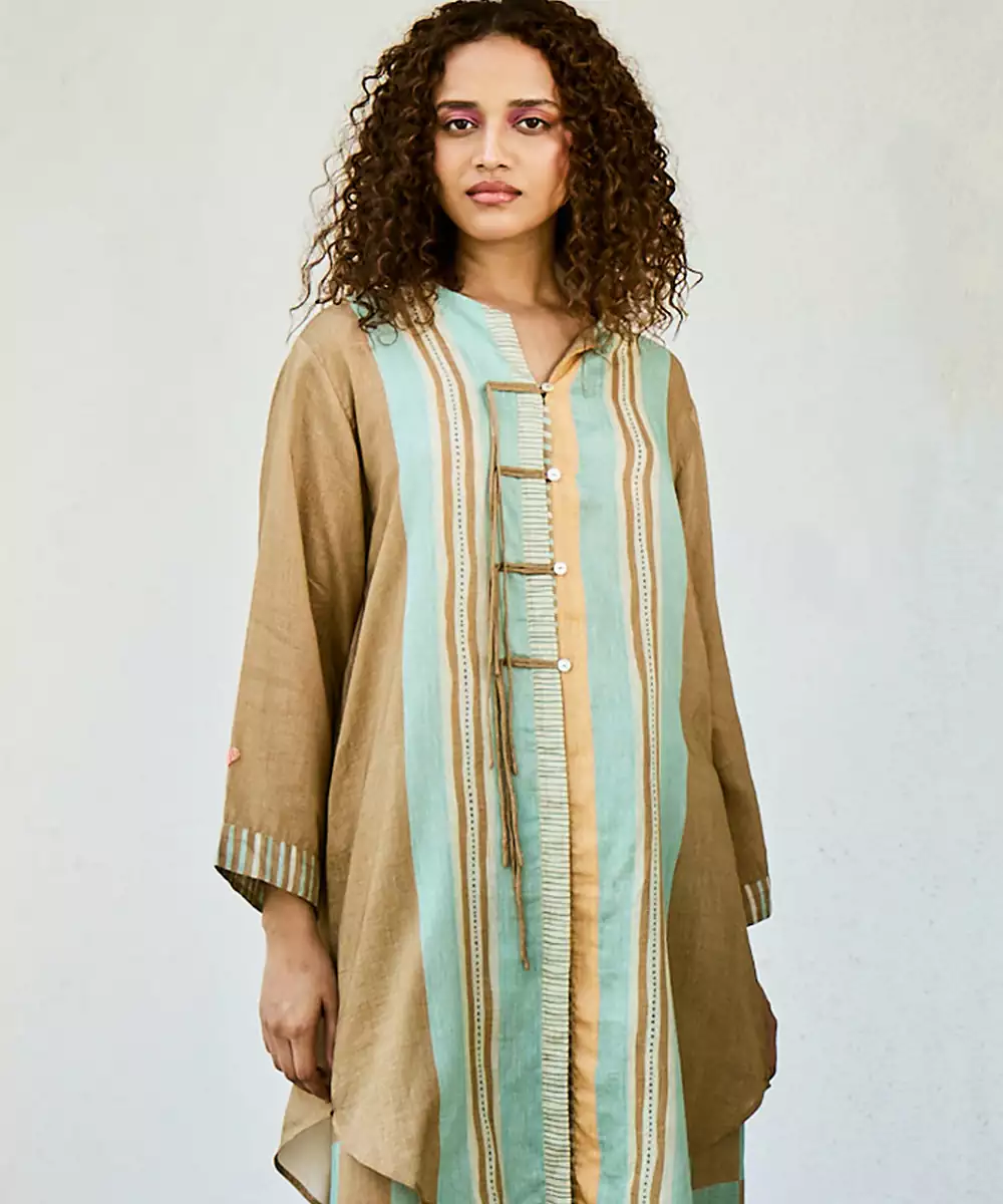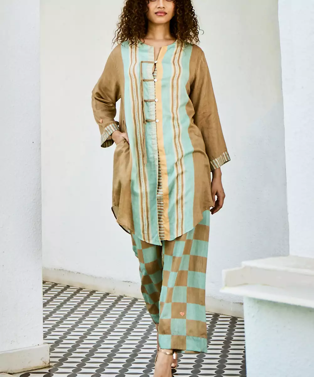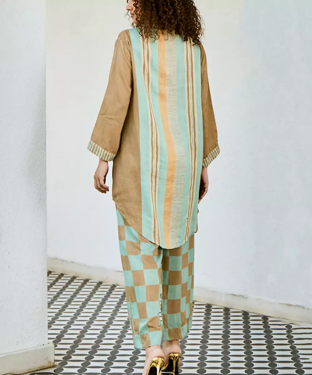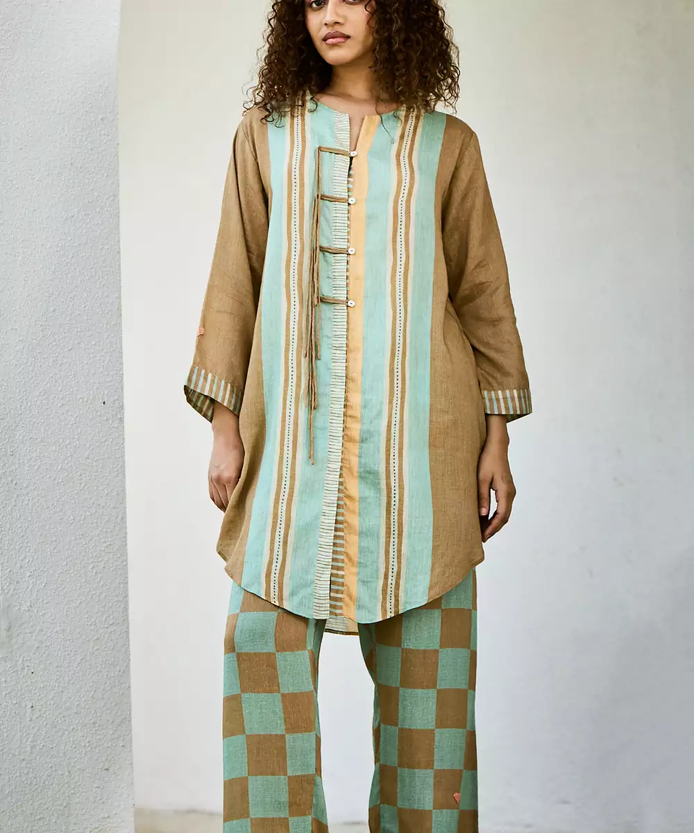 This Brown Linen Kurta Set Showcases Earthy Prints That Enhance Its Natural Appeal. The Breathable Fabric Ensures Comfort, While The Design Offers A Relaxed Fit. Ideal For Casual Outings, It Pairs Effortlessly With Simple Accessories For A Stylish And Easygoing Everyday Look.