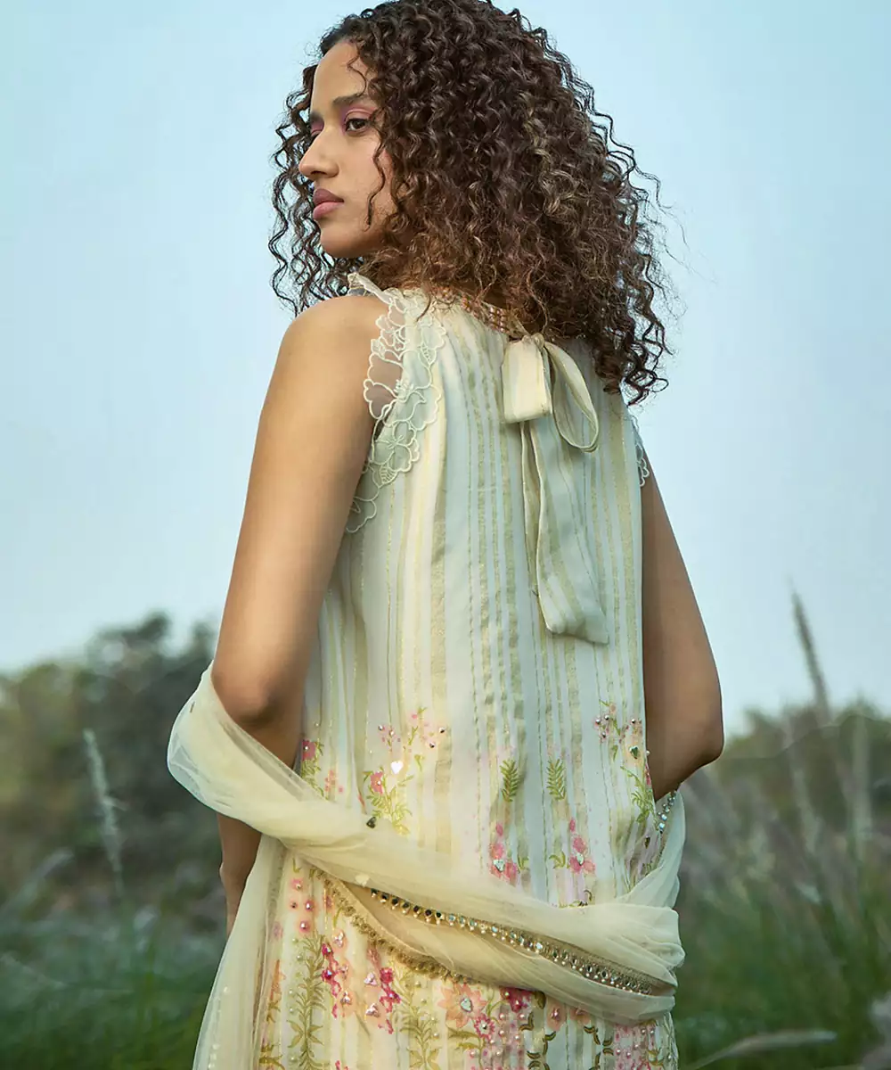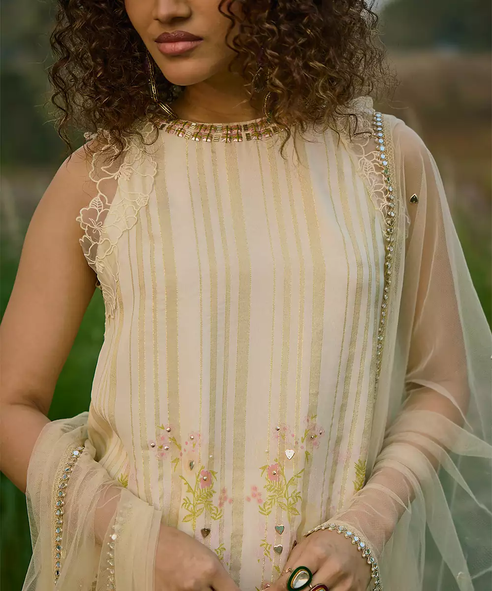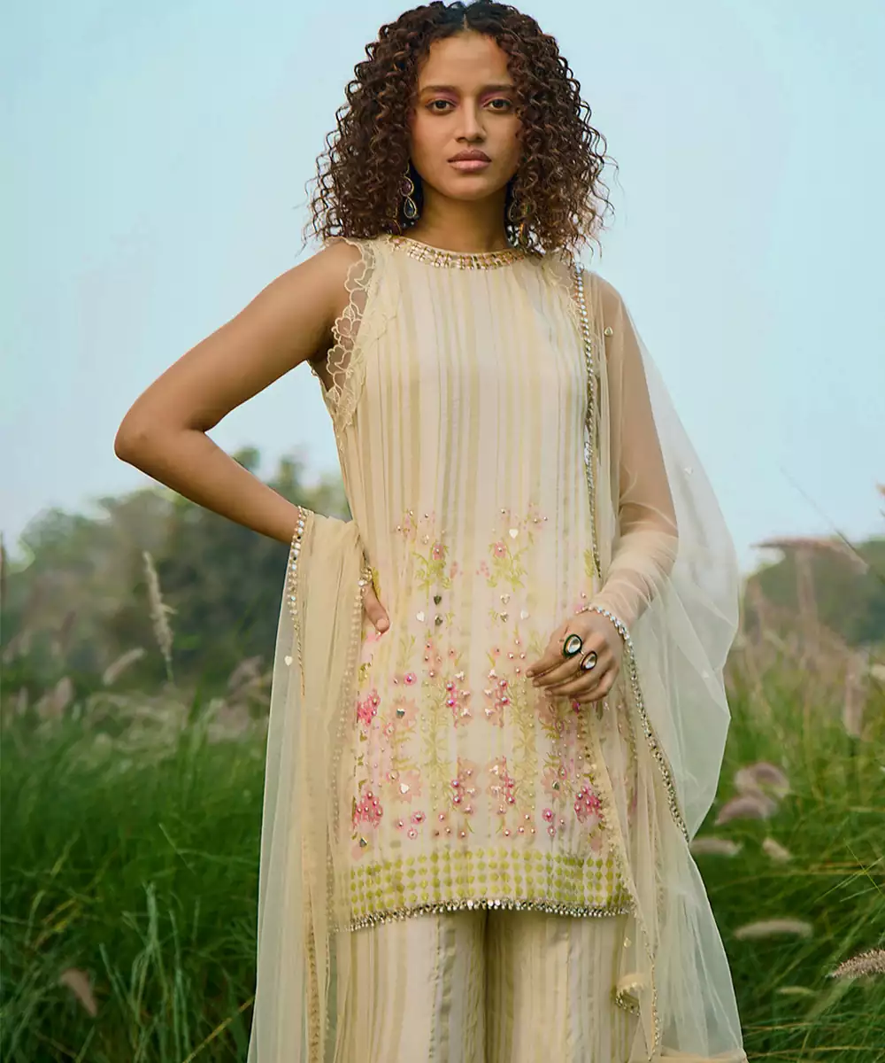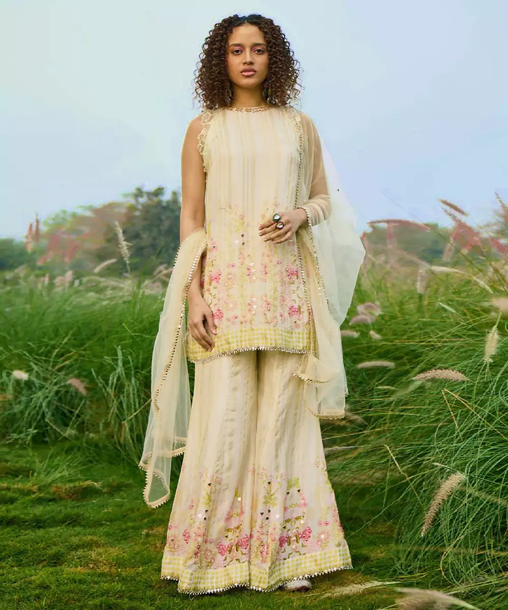 This Cream Net Sharara Set Showcases Intricate Embroidery That Adds A Touch Of Elegance. The Lightweight Fabric And Flared Sharara Create A Graceful Silhouette. Perfect For Festive Occasions Or Celebrations, It Pairs Beautifully With Statement Jewelry For A Sophisticated And Timeless Look.