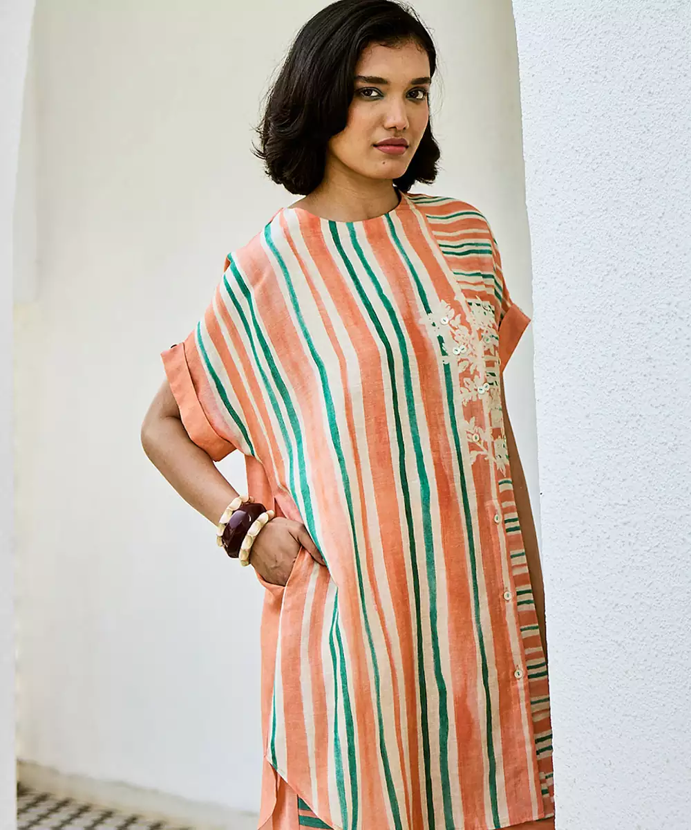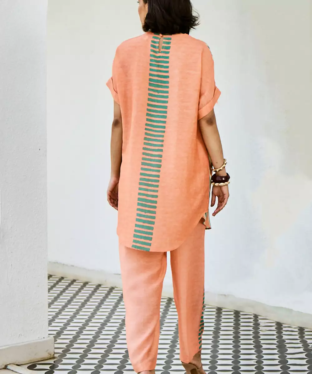 This Peach Linen Kurta Set Showcases Soft Prints That Complement Its Soothing Tone. The Breathable Fabric Ensures Comfort, While The Relaxed Silhouette Enhances Its Appeal. Ideal For Daytime Outings, It Pairs Effortlessly With Subtle Accessories For A Graceful And Stylish Appearance.