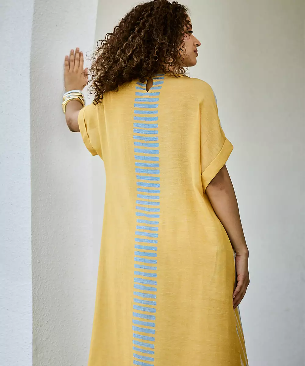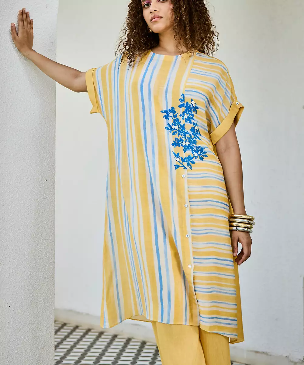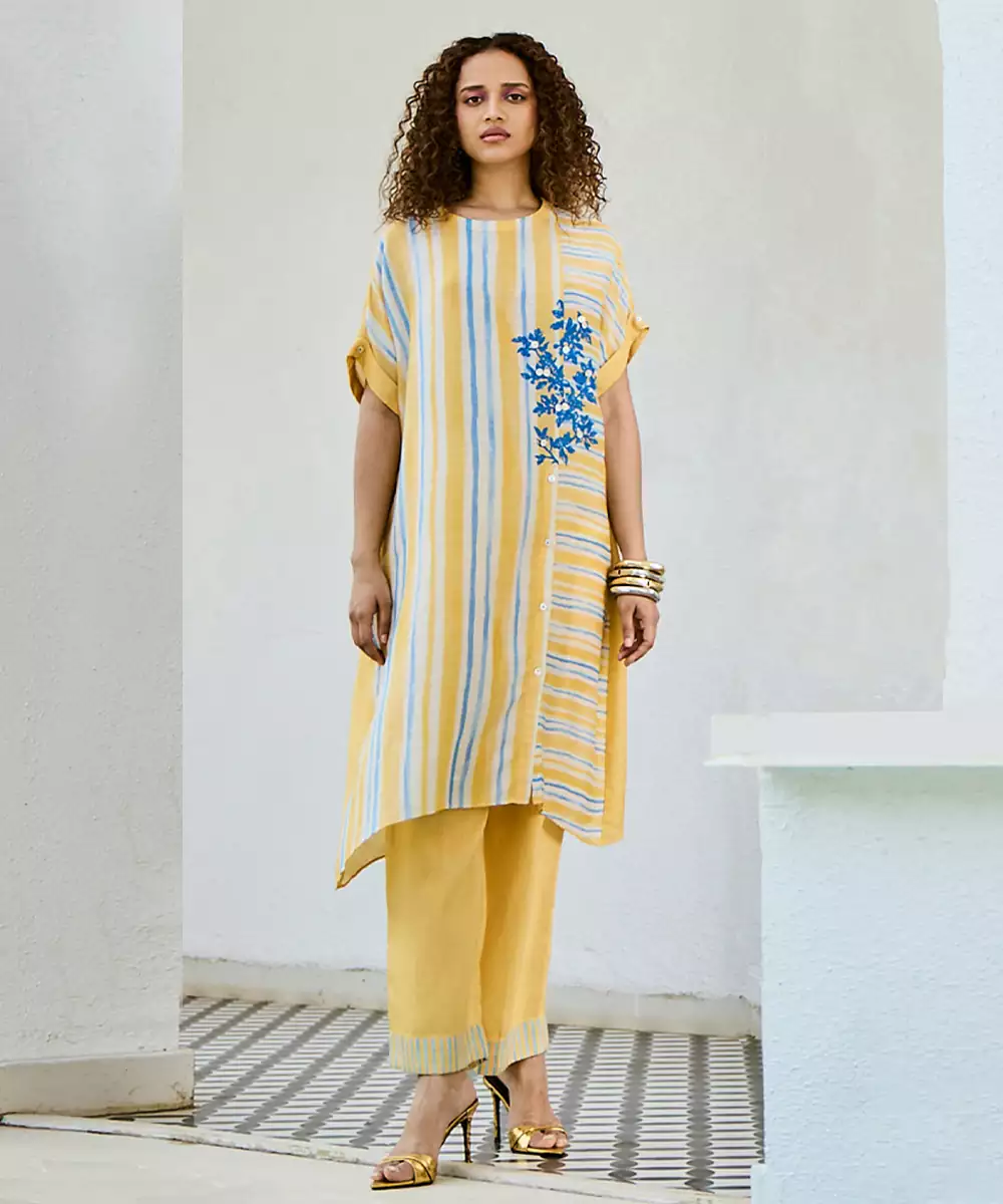 Bright And Cheerful, This Yellow Linen Kurta Set Features Stylish Prints That Enhance Its Casual Charm. The Breathable Fabric Ensures Comfort, While The Relaxed Silhouette Offers Versatility. Ideal For Daytime Outings Or Casual Gatherings, It Pairs Easily With Minimal Accessories For A Fresh And Elegant Look.