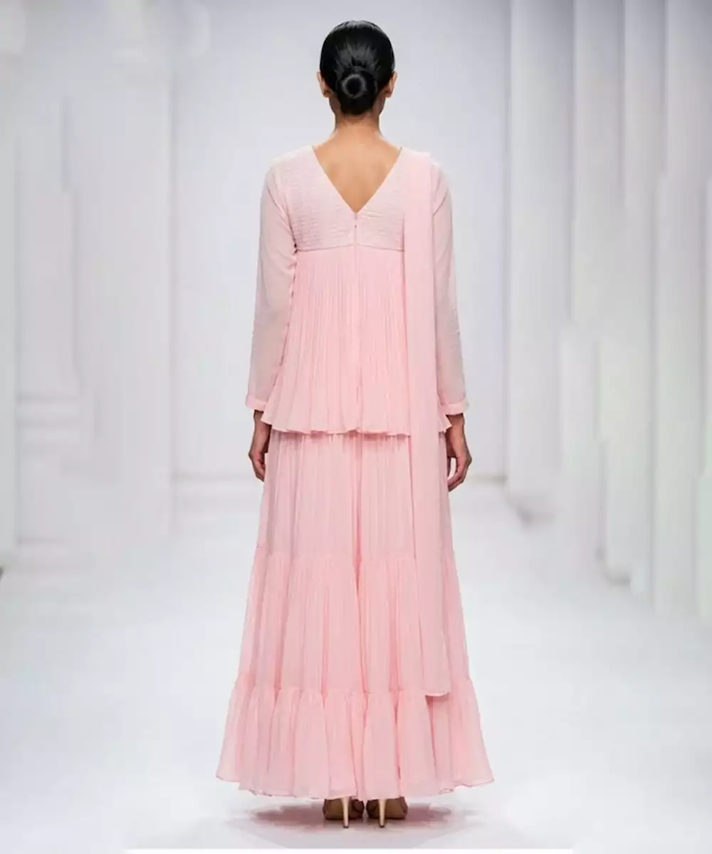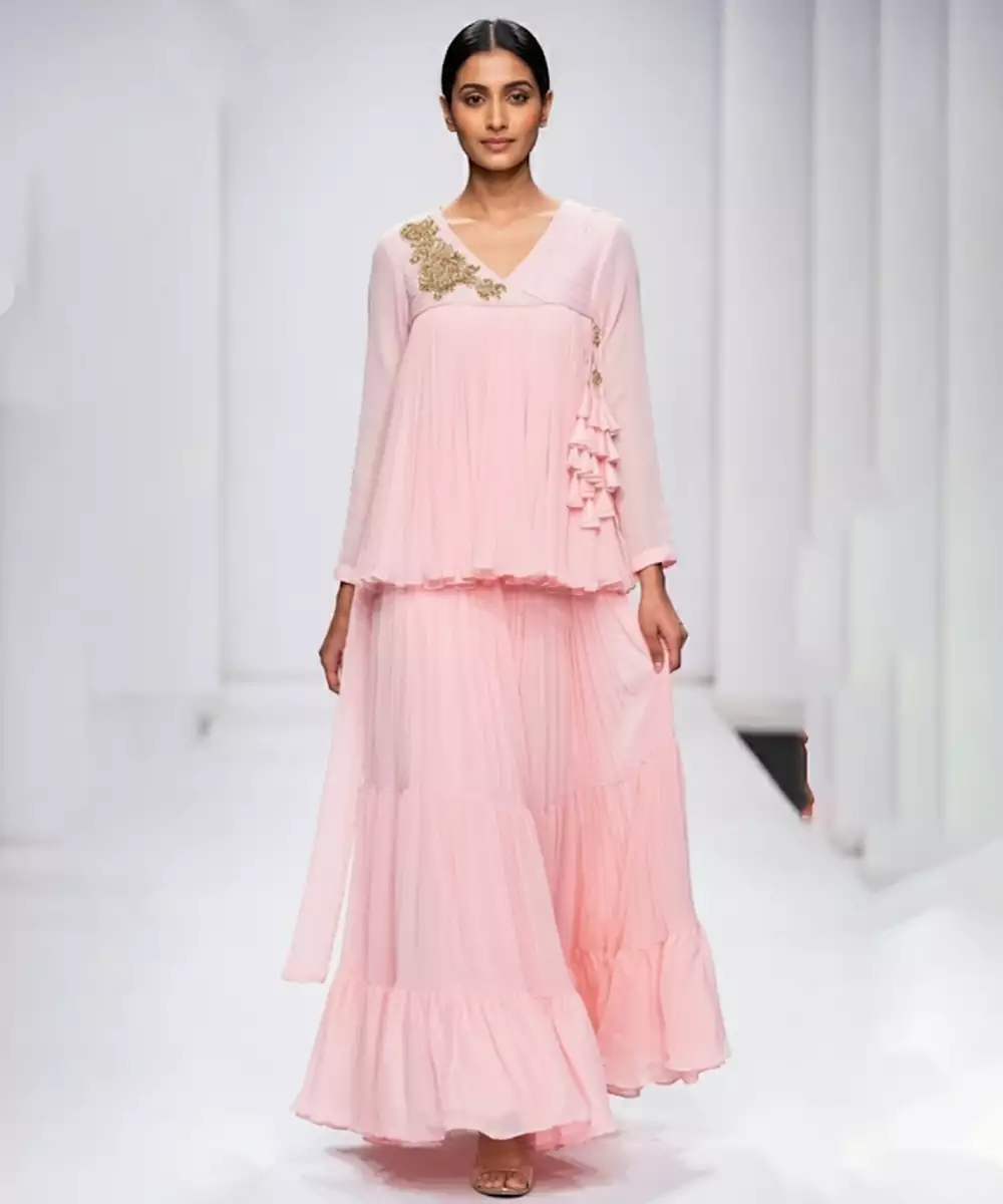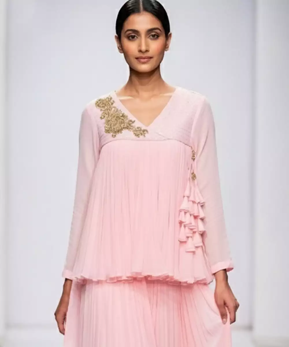 This Baby Pink Embroidered Georgette Co Ord Set Reflects Soft Elegance With Delicate Detailing. The Lightweight Fabric Drapes Gracefully, While Intricate Embroidery Enhances Its Feminine Charm. Perfect For Festive Gatherings, Celebrations, And Daytime Occasions.