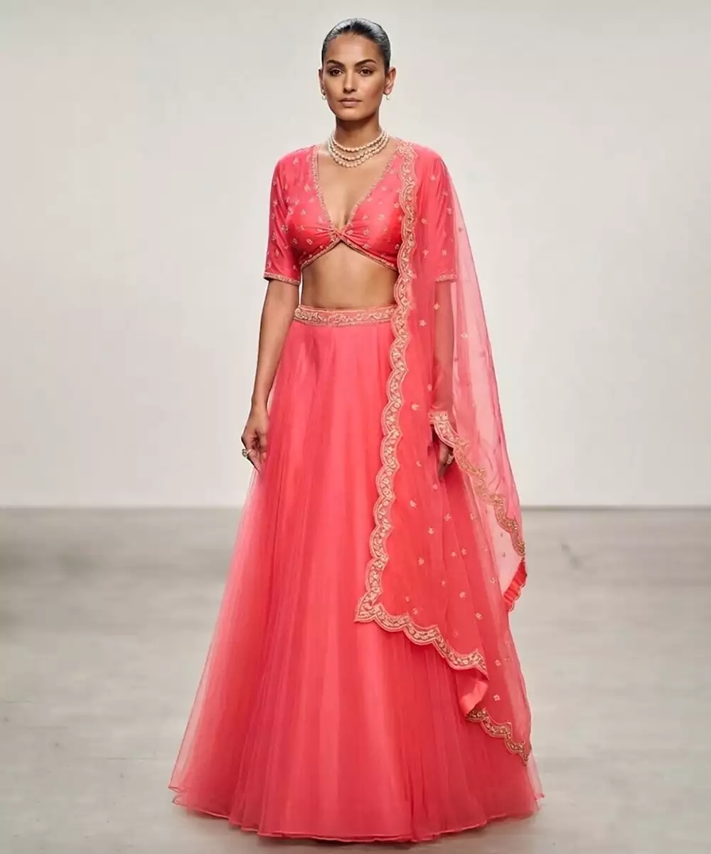 This Coral Pink Organza Lehenga Set Showcases Intricate Embroidery That Adds Charm And Elegance. The Sheer Fabric Offers A Lightweight And Graceful Drape. Ideal For Festive Occasions, It Pairs Effortlessly With Minimal Accessories For A Chic And Feminine Look.