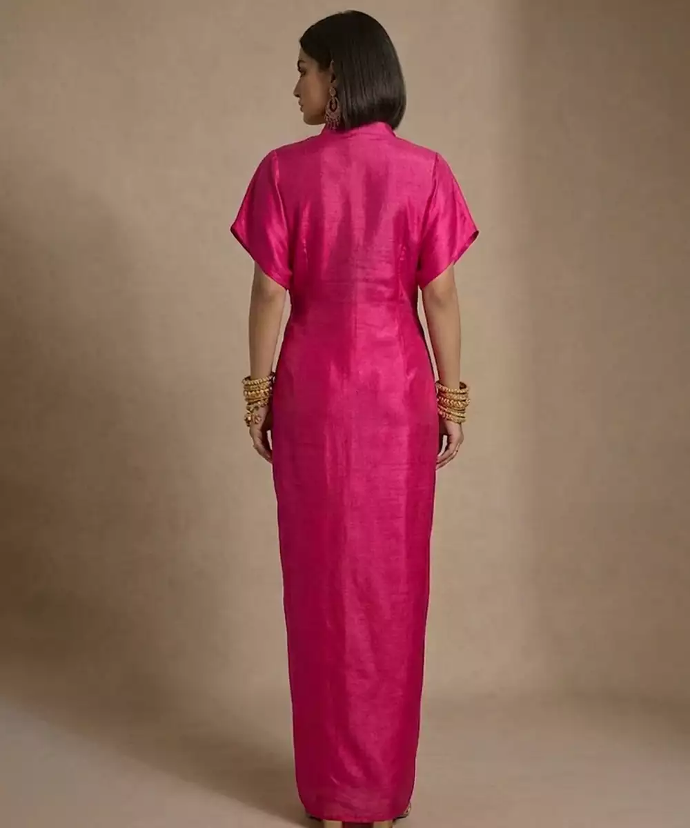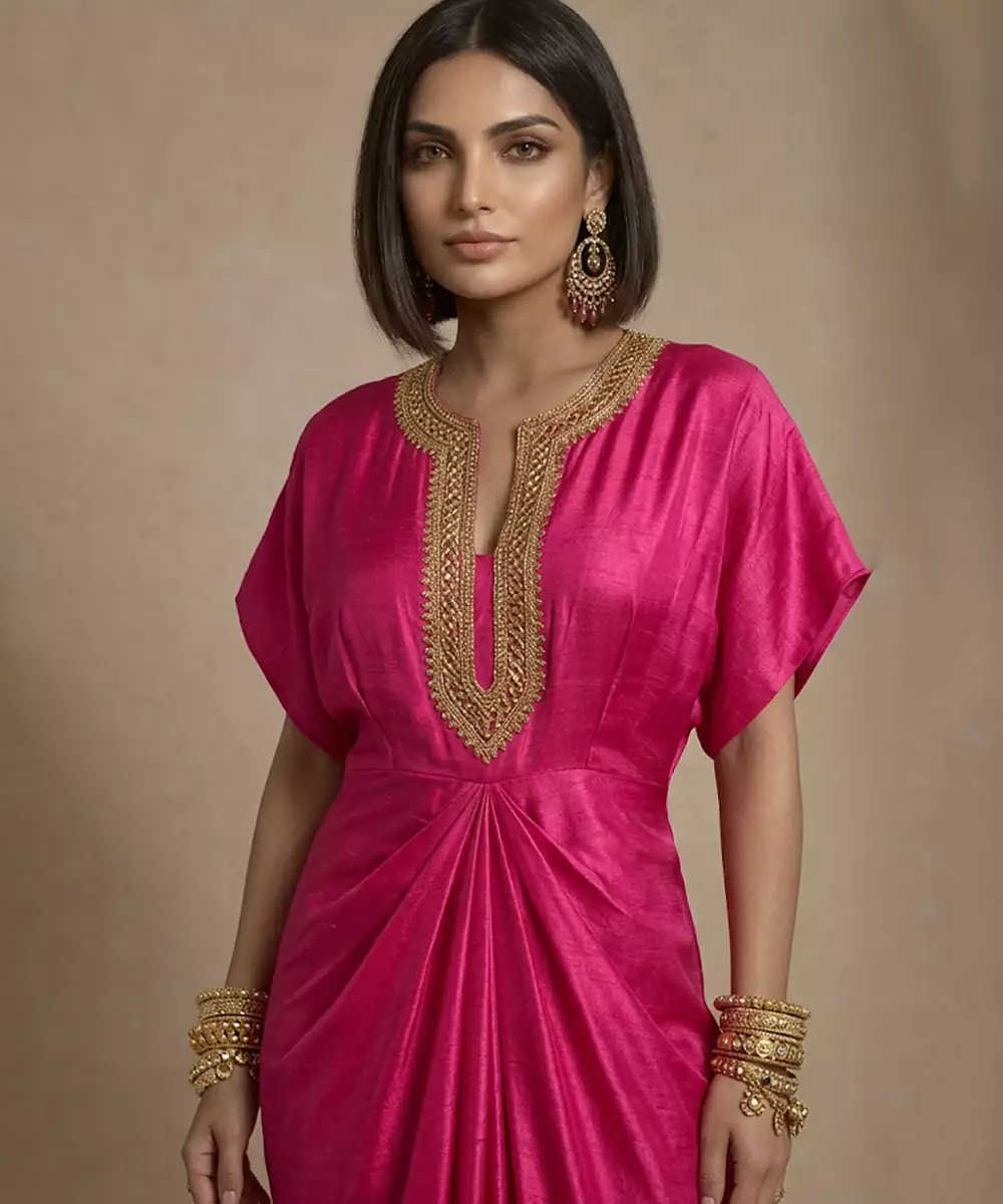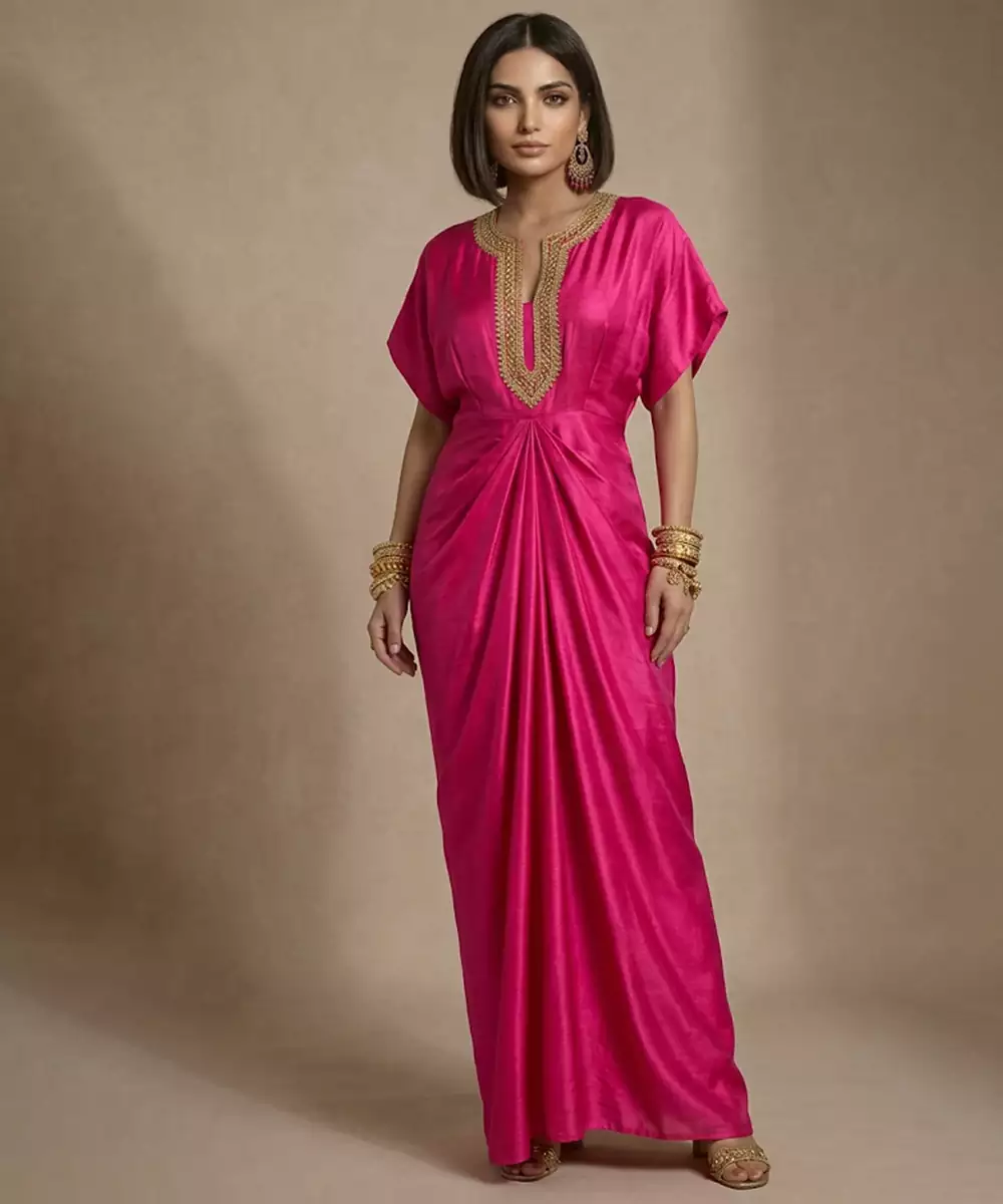 This Pink Satin Silk Kaftan Is Beautifully Enhanced With Intricate Embroidery, Creating A Graceful Blend Of Comfort And Elegance. The Rich Texture Of Raw Silk Adds A Luxurious Feel, While The Relaxed Silhouette Ensures Effortless Movement. Ideal For Festive Gatherings, Weddings, And Elegant Evening Celebrations.