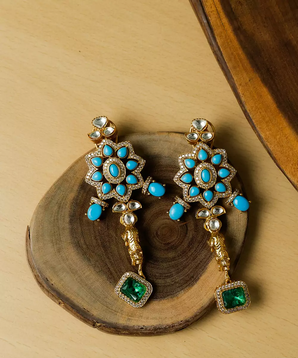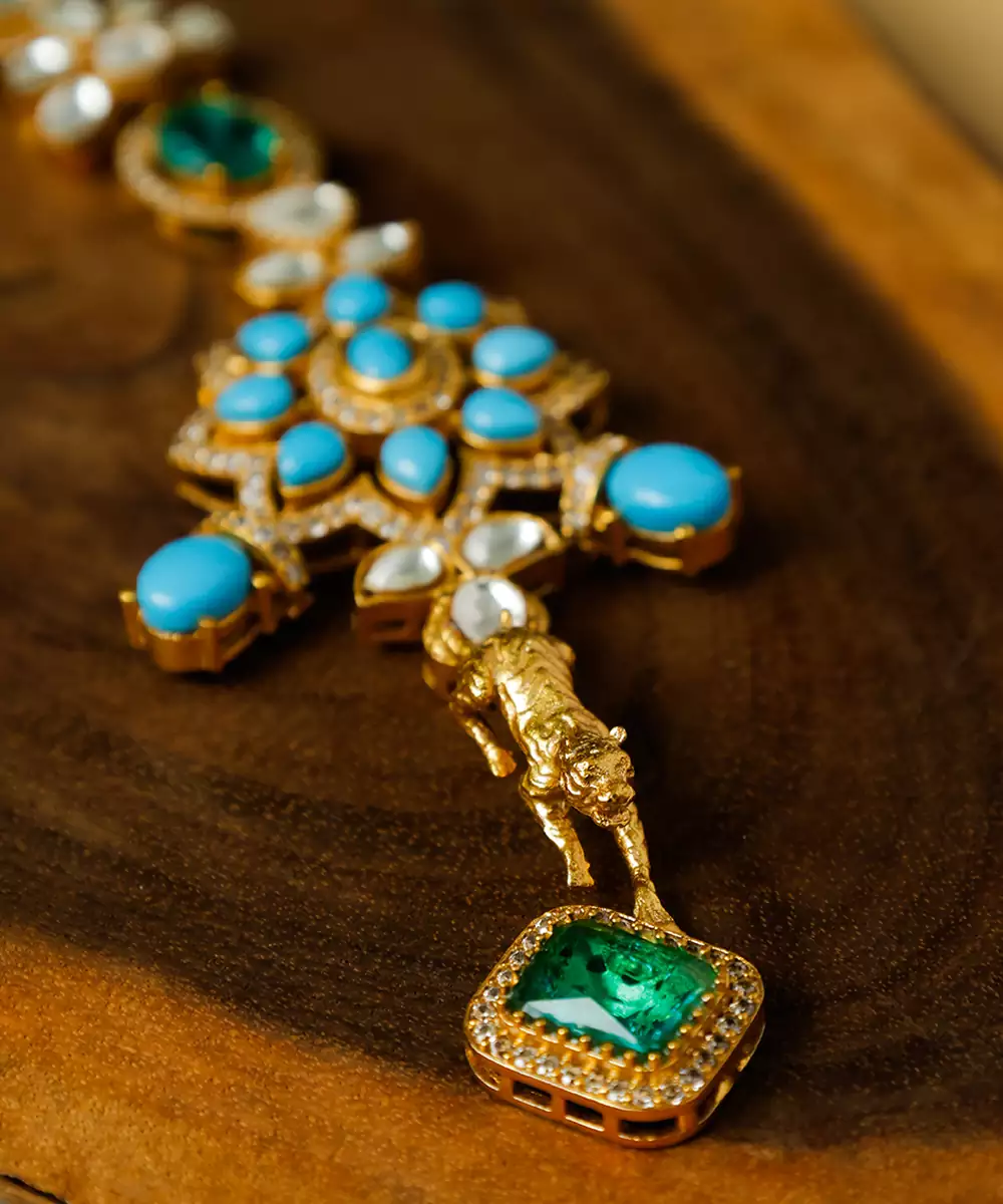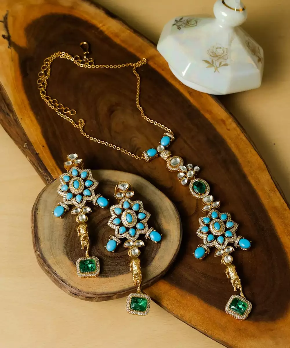 Beautiful Gold Plated Set Featuring Blue Beads & Metal Tiger Symbolising A Royal Traditional Look
